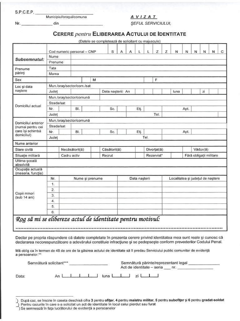 Download formular model de cerere pentru eliberarea actului de identitate in format pdf, word, doc,. (1) actele de identitate din sistemul naţional de paşapoarte sînt: Cererile pot fi completate olograf sau prin alte sisteme de tehnoredactare, cu excepția rubricii destinată semnăturii, care trebuie completată numai olograf.