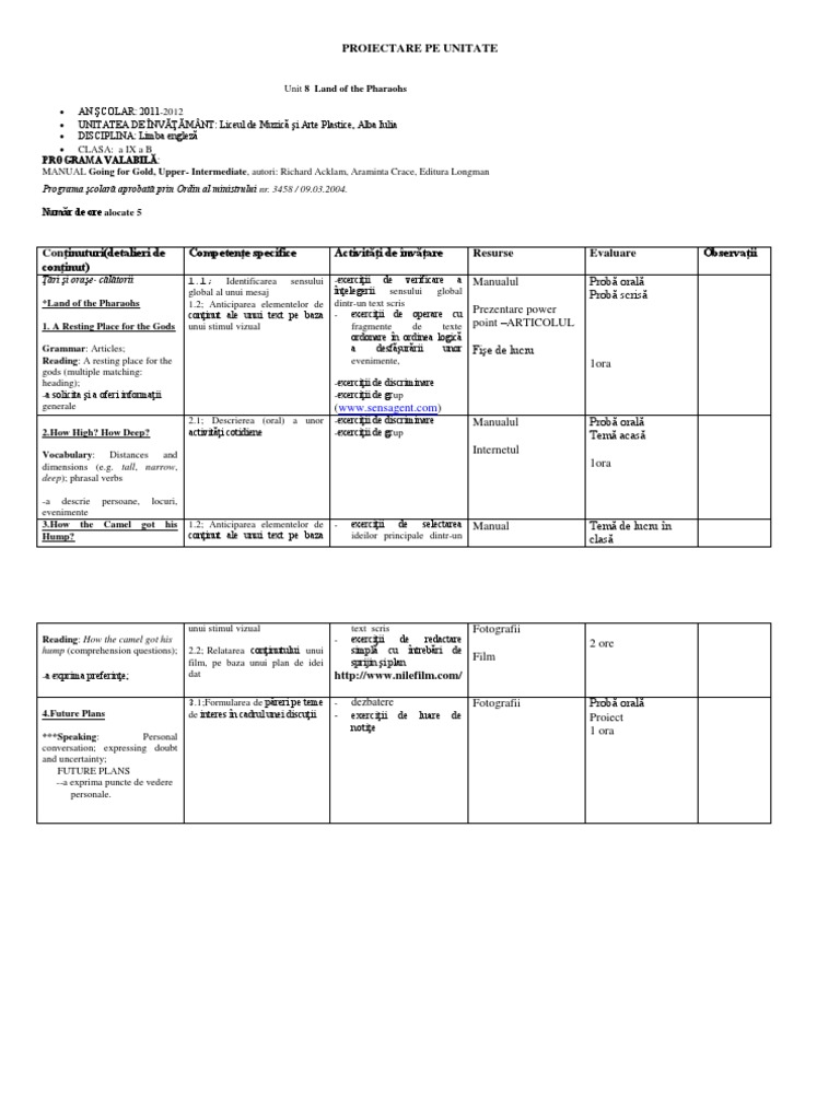 Planificare Pe Unitati De Invatare
